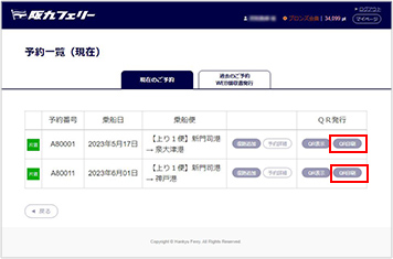 ご乗船時、マイページへアクセスして表示またはスクリーンショット等で保存した画像を係員にご提示ください。※スクリーンショット等で画像保存を推奨します。