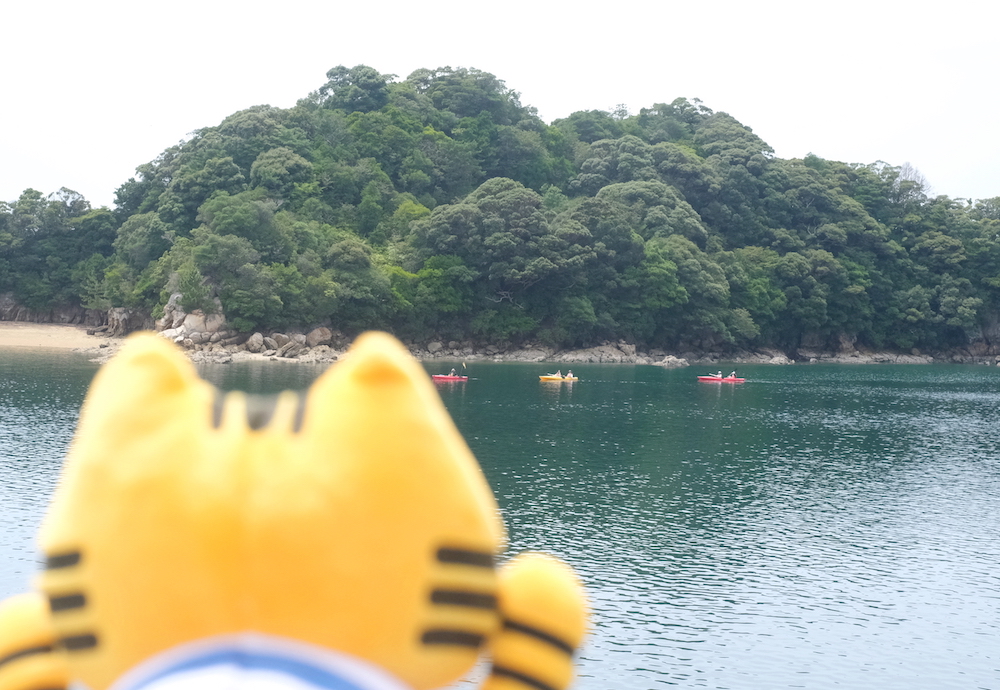 シーカヤックを楽しむ人たちを発見! お〜いと手を振ると笑顔で振り替えしてもらえて、そんなシチュエーションも遊覧船の醍醐味のひとつ。