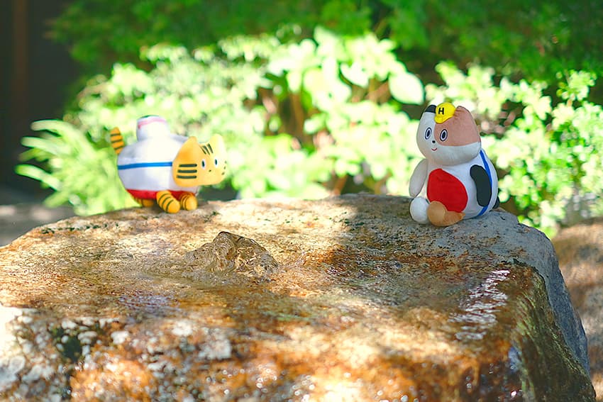 湯⽥温泉をさらに堪能するために、ふねこたちは“国登録有形⽂化財の宿”として有名な『名勝 ⼭⽔園』を訪れました。