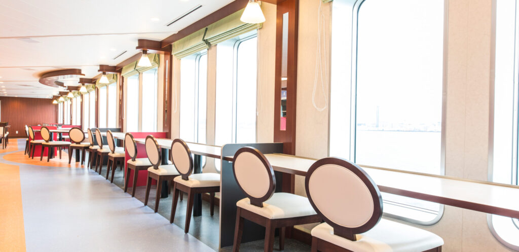ゆったりとした開放感が特長のレストランで、海を眺めて食事が楽しめるお席もご用意。各船の調理長自慢の料理をご堪能ください。