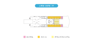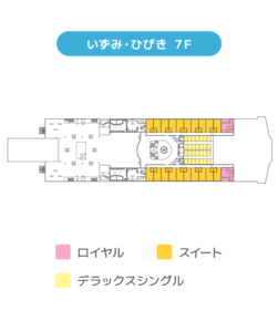 ※定期検査などで配船が変更になる場合がございます。※いずみ・ひびきの船内設備は同じです。 7Fフロア ロイヤル バス・トイレ・テレビ・プライベートデッキ付き 部屋タイプ:洋室 定員・部屋数:2名・2室 広さ:36.5㎡ ベッド幅:110×200(cm) スイート バス・トイレ・テレビ付き 部屋タイプ:洋室 定員・部屋数:2名・20室 広さ:21.1㎡ ベッド幅:100×200(cm) デラックスシングル テレビ付き 部屋タイプ:洋室 定員・部屋数:1名・28室 広さ:5.2㎡ ベッド幅:80×200(cm) 7Fフロアの船内図はこちら × 6Fフロア デラックス和洋室(3人部屋・4人部屋) テレビ・洗面台付き 部屋タイプ:洋室 定員・部屋数:3名・29室(4名・4室) 広さ:13.5㎡ ベッド幅:3人部屋 90×200(cm) 4人部屋 85×200(cm) デラックス和室 テレビ・洗面台付き 部屋タイプ:和室 定員・部屋数:3名・6室 広さ:12.9㎡ ベッド幅:70×190(cm) スタンダード洋室(レディースあり) リターン式コインロッカー付き 部屋タイプ:洋室 定員・部屋数:16名・12室 ベッド幅:75×200(cm) 6Fフロアの船内図はこちら × 5Fフロア デラックス洋室 4名部屋 テレビ・洗面台付き 部屋タイプ:洋室 定員・部屋数:4名・20室 広さ:12.4㎡ ベッド幅:80×200(cm) デラックス洋室 バリアフリー テレビ・洗面台付き 部屋タイプ:洋室 定員・部屋数:2名・2室 広さ:15㎡ ベッド幅:100×200(cm) スタンダード和室(バリアフリーあり) リターン式コインロッカー付き 部屋タイプ:和室仕様 定員・部屋数:14名・3室、12名・1室※バリアフリー含む ベッド幅:1人分のスペース:約70cm スタンダードシングル(ドライバールーム) 部屋タイプ:洋室 定員・部屋数:1名・102室 ベッド幅:75×200(cm) 5Fフロアの船内図はこちら ×