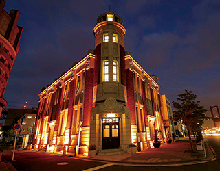 현재 와카마쓰에 남아있는 근대 건축 중에서도 당시의 용맹한 모습을 간직하고 있으며, 화려한 외관을 가진 건물입니다. 벽돌로 된 2층 건물은 다이쇼8년(1919년) 건축이라고 하며, 앞면과 옆면을 달리는 도로의 교차 각도에 맞춘 예각으로 되어 있고, 그 선단에는 3층 부분까지 뻗은 수직선을 강조하는 탑이 배치되어 있습니다. 또한 원포인트로 다룬 옥탑의 채광창도 이 건물의 특징입니다. 헤이세이 16년(2004년)에 보존 공사를 거쳐 교류·문화·관광의 거점으로 거듭나, 밤에는 라이트 업으로 아름답게 비춰진 모습도 인상적입니다.