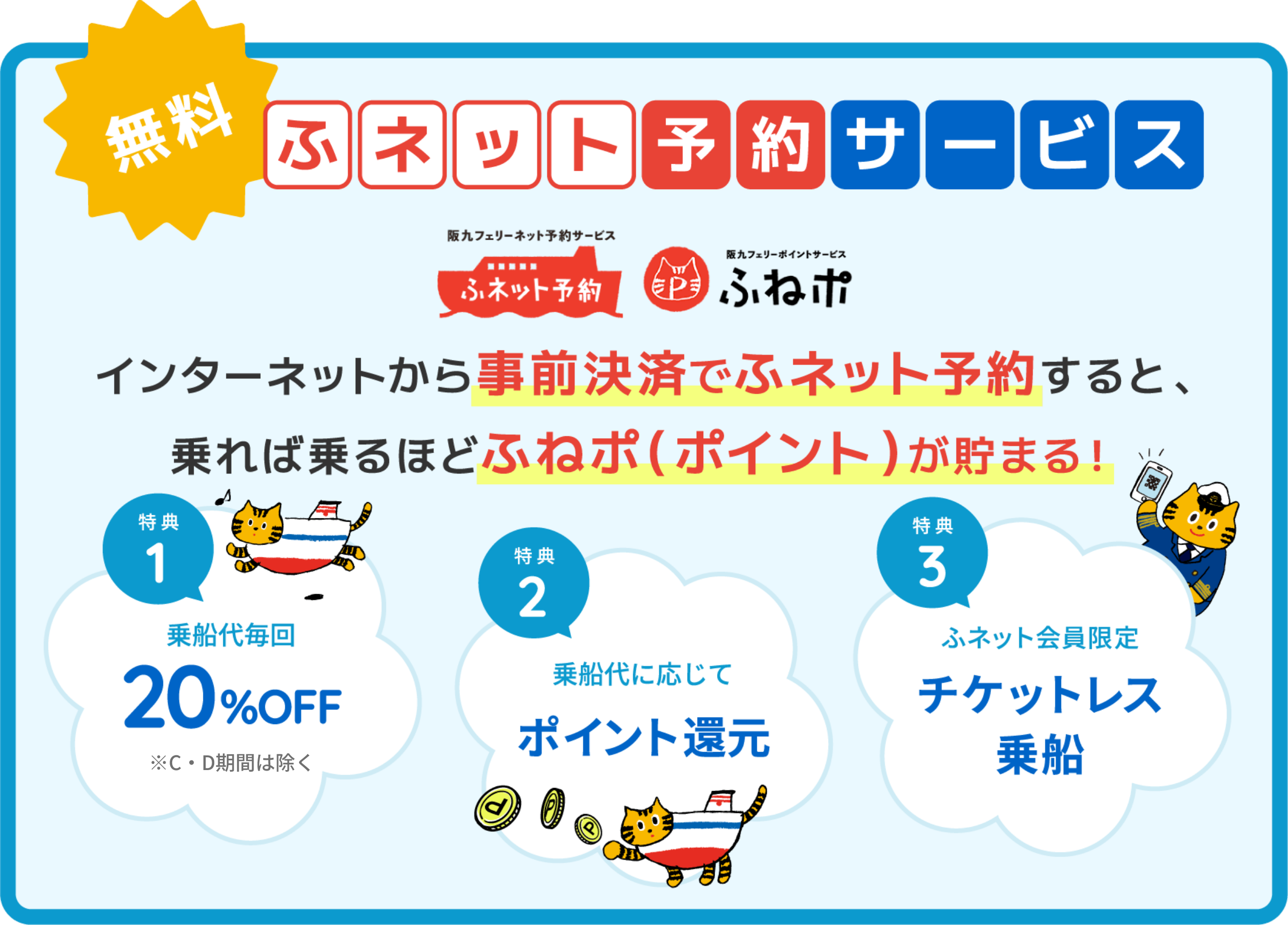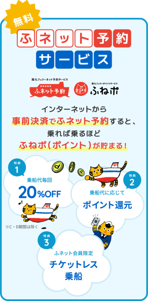 ポイントの付与・ポイントのご利用は、ふネット予約(新システム)で乗船代の支払いをクレジットカードで事前決済した場合のみ適用されます。お電話でのご予約、窓口での当日払いを選択された場合は、適用外になります。
