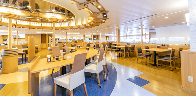 ゆったりとした開放感が特長のレストランで海を眺めて食事が楽しめるお席もご用意。各船の調理長自慢の料理をご堪能ください。
