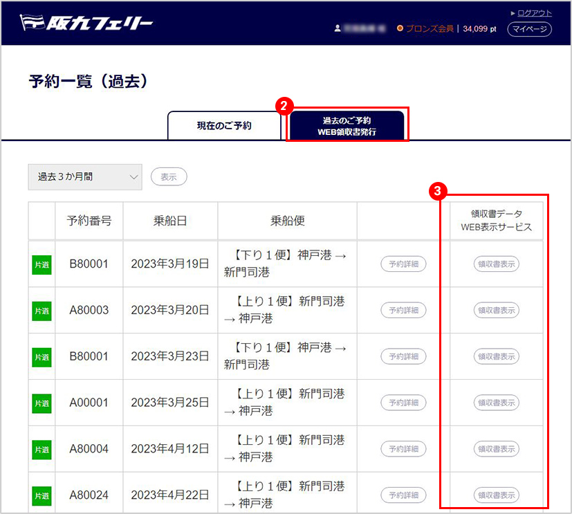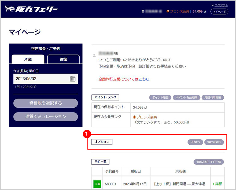 ※領収書金額は、インターネットでの乗船額が表示され、内訳としてカ-ド決済額、ポイントが表示されます。ご乗船当日、乗り場窓口で変更・一部取消があった場合は、窓口で領収書発行をお申し出ください。